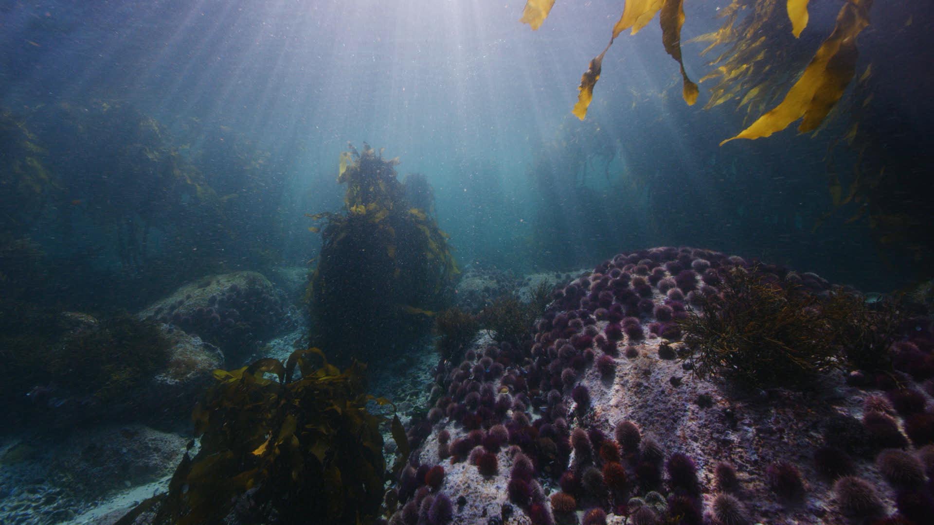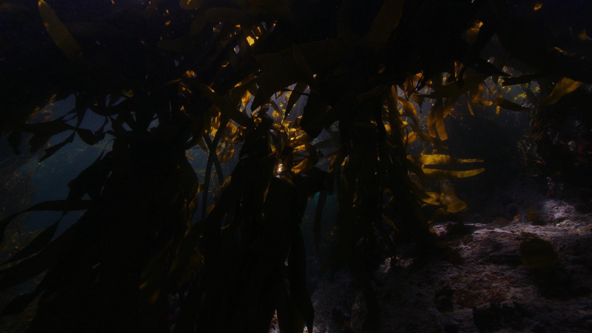 Claustrophobic dolly shot breaking through Kelp to Seabed